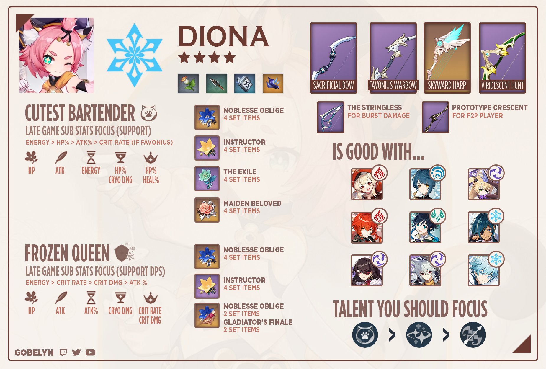 It is the additional damage. You will want to primarily focus on leveling up her skill. Diona is an archer, so she'll need a powerful bow to pair with her cryo attacks. Unless you plan to have diona on the field for longer periods of time to get walloped, a ful. Alongside tartaglia, genshin impact diona is the latest character to arrive in the game as of update 1.1.